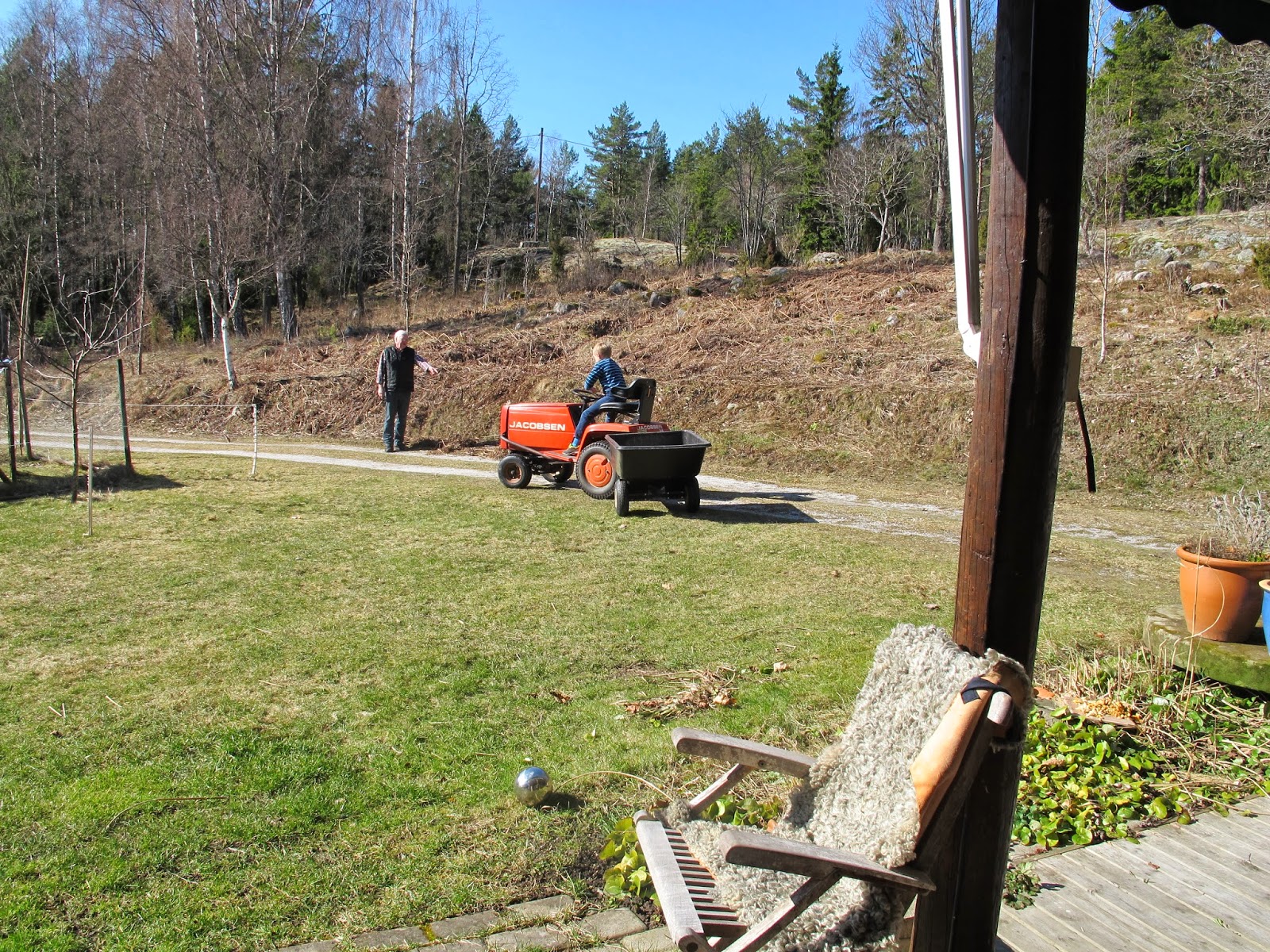 Vårstädning i trädgården, Måns kör släpkärran för